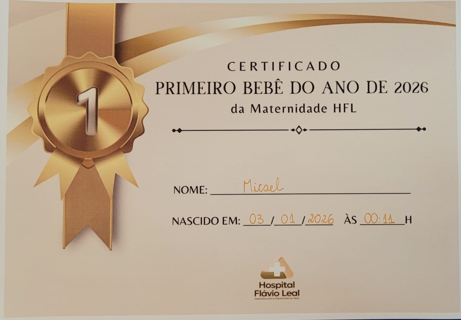 Hoje, 16 de dezembro de 2026 pela manhã, recebemos para revisão a mamãe Carolliny, junto com Micael, o primeiro bebê que nasceu no Hospital Flávio Leal em 2026. Foi uma grande alegria acolher essa família e realizar a entrega do Certificado do 1º Bebê do Ano de 2026 no HFL.